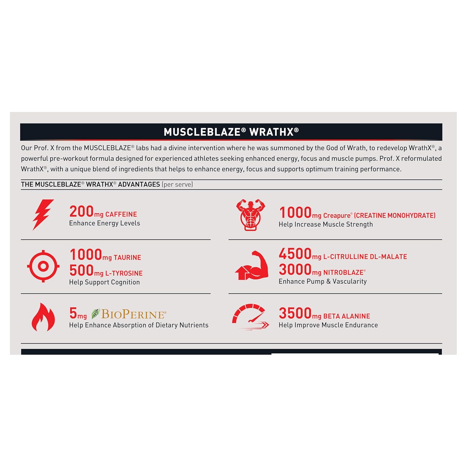 - PRE WORKOUT SUPPLEMENTS FOR MEN & WOMEN: The all-new MuscleBlaze WrathX is the ultimate pre-workout mix to give you an advanced level of performance that you have never witnessed before. It is powered with a unique combination of Caffeine, EnXtra and Theanine for explosive energy for every workout. Enjoy it in a refreshing fruit fury flavour