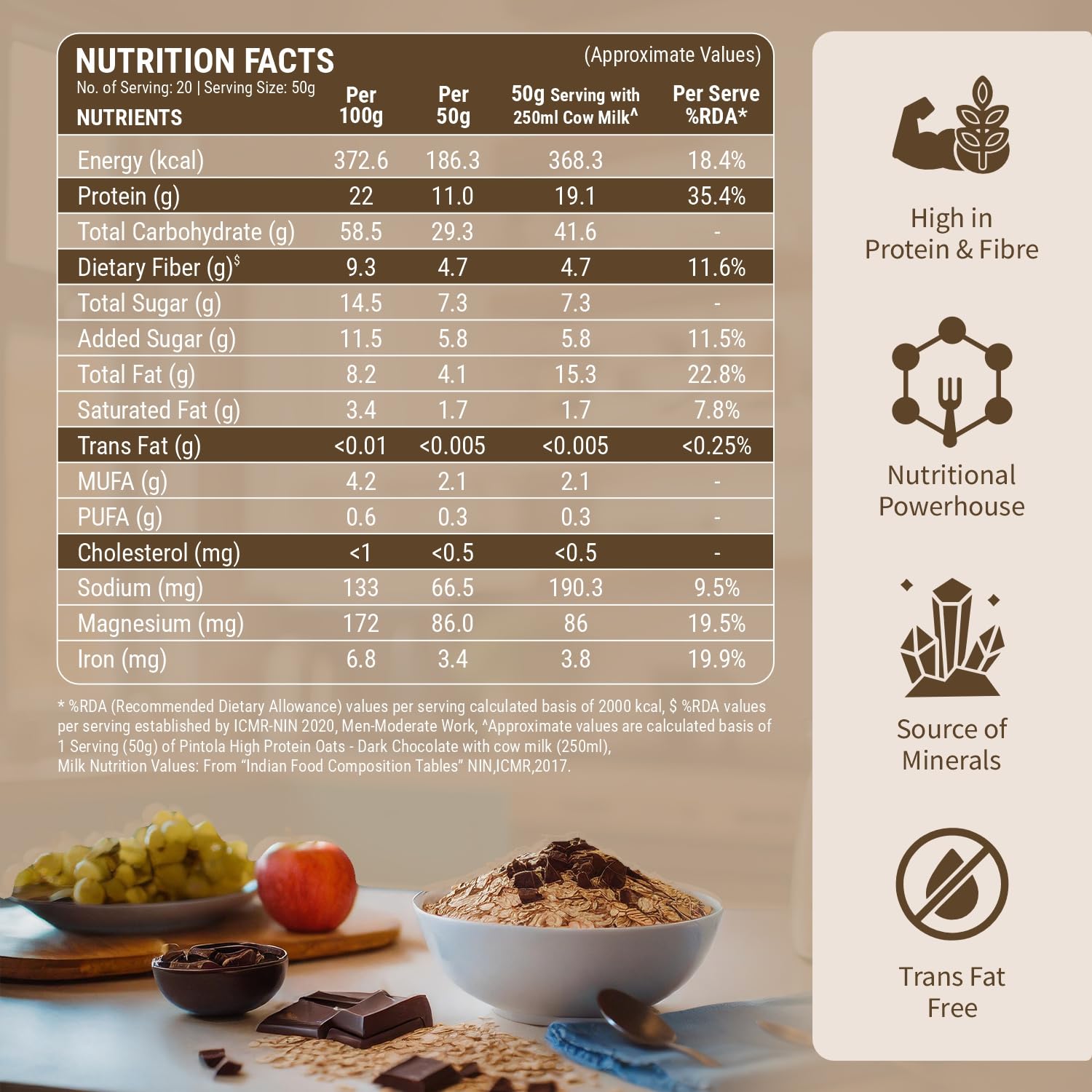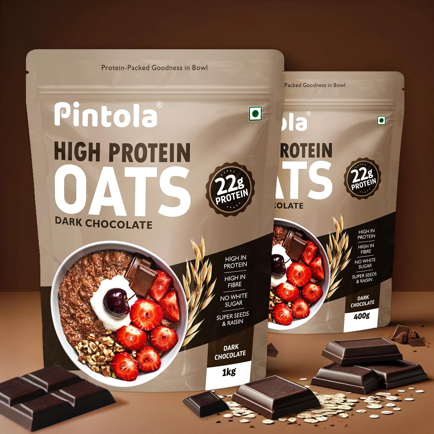 - Protein-Packed Wellness: Pintola High Protein Oats Dark Chocolate flavour, boast a substantial 22g of protein per 100g of serving, making every spoonful a step towards sustained energy and fullness.